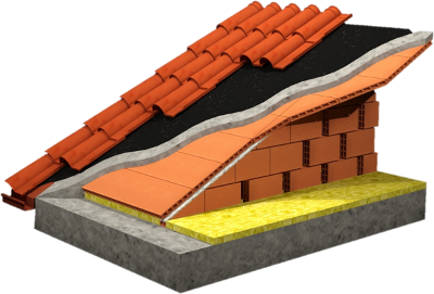 El aislante térmico puede ir por encima o por debajo del soporte (tablero cerámico y capa de mortero), y por último se coloca la cobertura, ya sea teja sobre rastreles, pavimento, pizarra, etc.